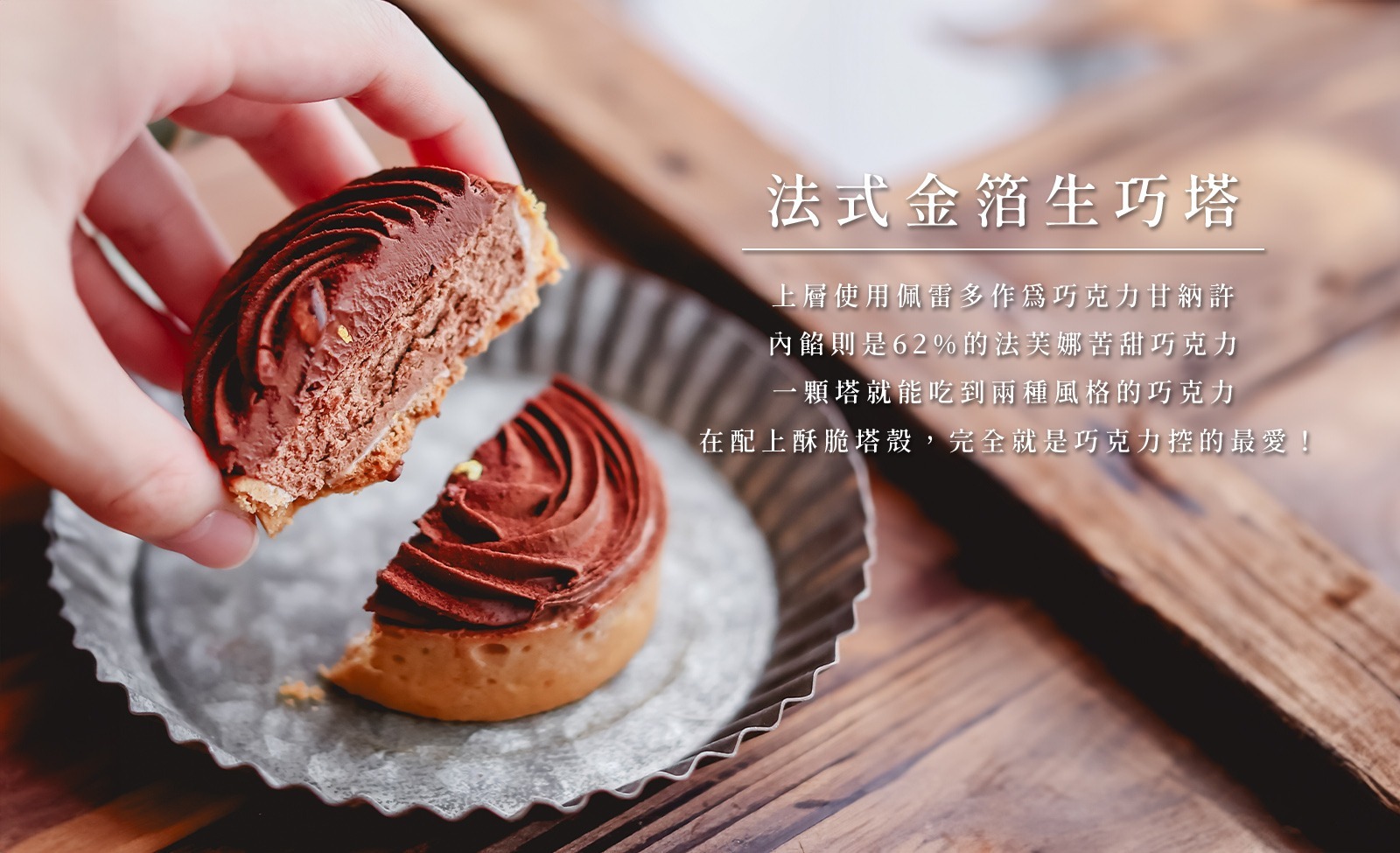 內餡使用62%法芙娜苦甜巧克力,上層裝飾甘那許巧克力使用佩雷多,拉姆的巧克力塔可以吃到兩種巧克力!再配上酥脆塔皮,完全就是巧克力控的最愛!