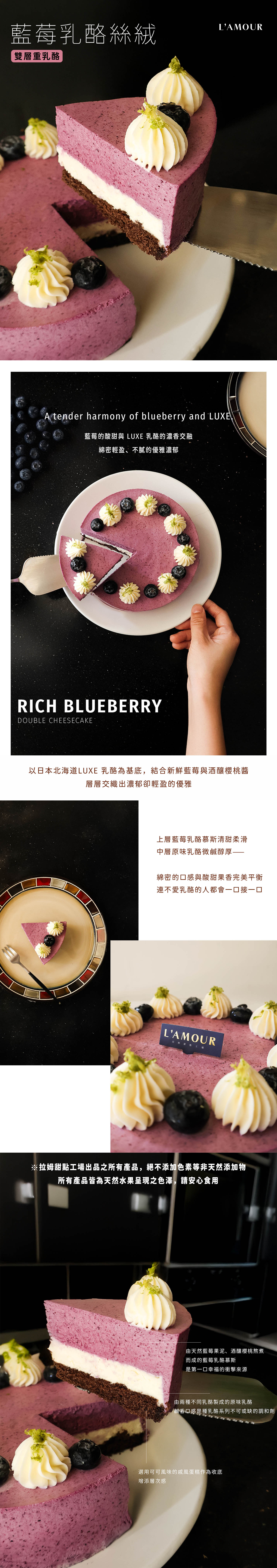 成分:北海道Luxe乳酪、天然藍莓果泥、新鮮藍莓、酒釀櫻桃醬、法國動物鮮奶油、麵粉、糖、蛋